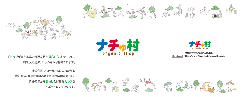 福岡にあるナチゅ村 organic shopのパンフレット内のイラストを担当。2021年制作